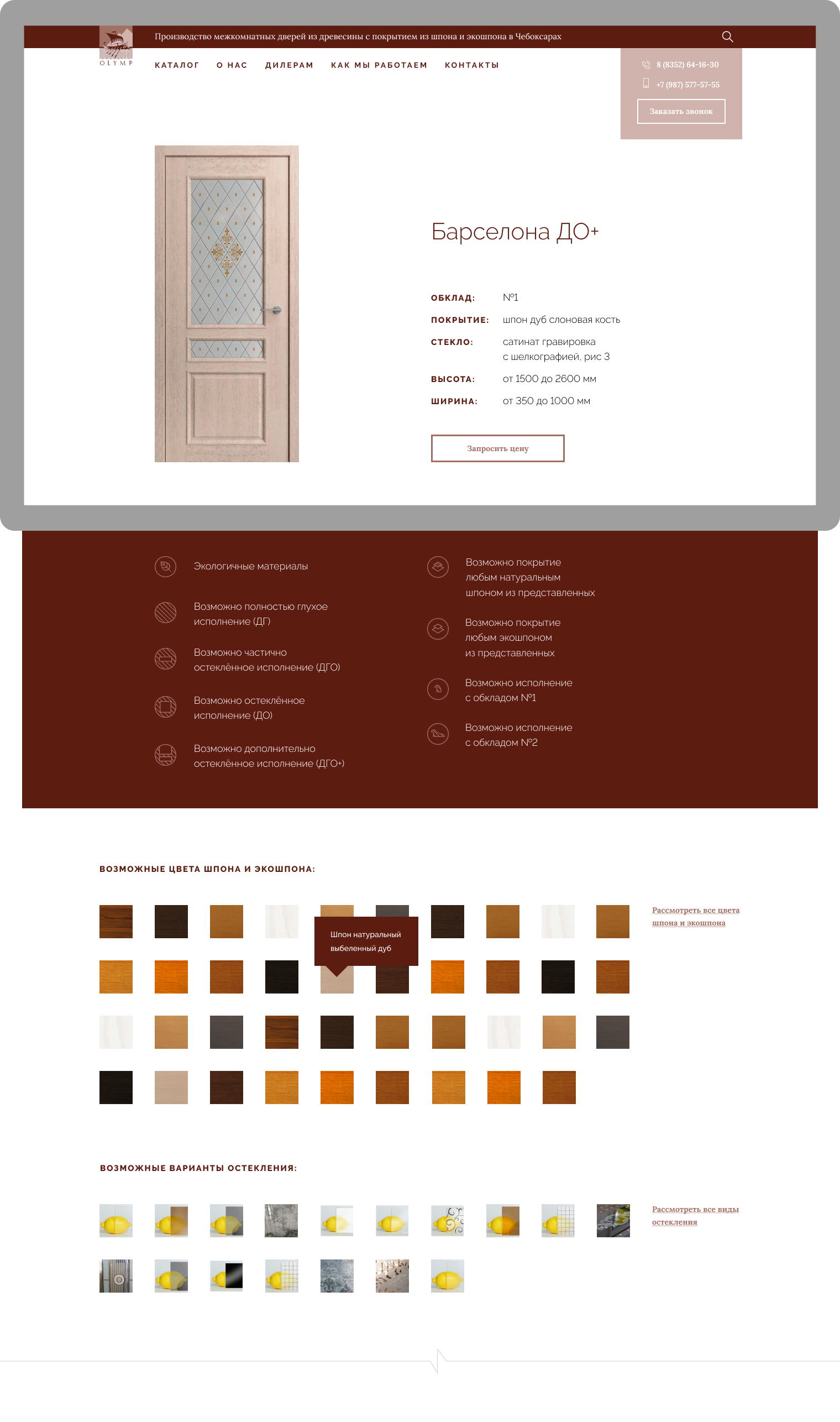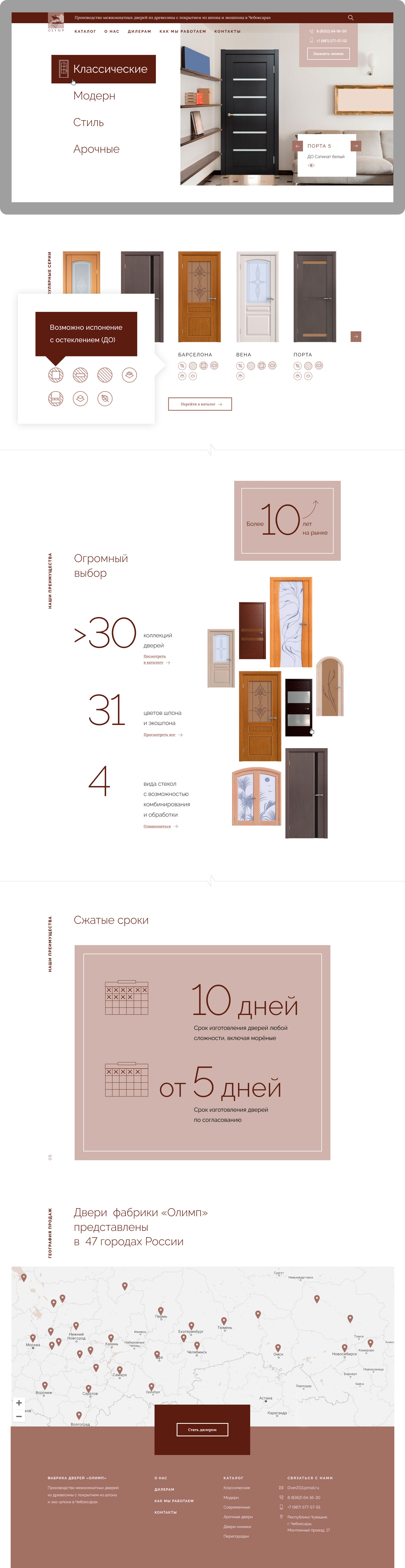 Задача разработать сайт-каталог для компании по производству дверей "Олимп". Целевой аудиторией сайта являются будущие дилеры, владельцы точек продаж и существующие дилеры, которым нужен легкий доступ к каталогу. Было необходимо описать какими основными преимуществами обладает компания, сделать легкий фильтр для обширного каталога дверей.